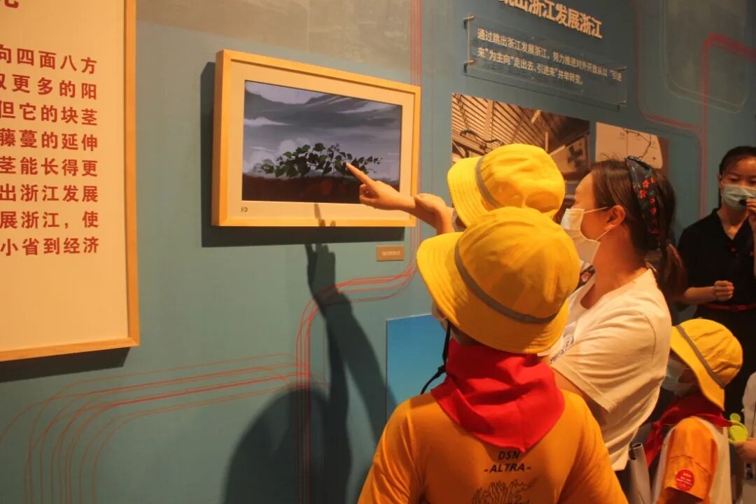 在讲解员姐姐的带领下,小朋友们参观了“大潮起东方 红色根脉育之江”、“春潮竞奔流 筚路蓝缕创基业”、“弄潮涛头立 思想萌发引航向”、“盛潮更扬帆 ‘重要窗口’开新局”4个篇章,共同感受建党百年的浓烈氛围,从小培养他们爱国爱党的情怀。
